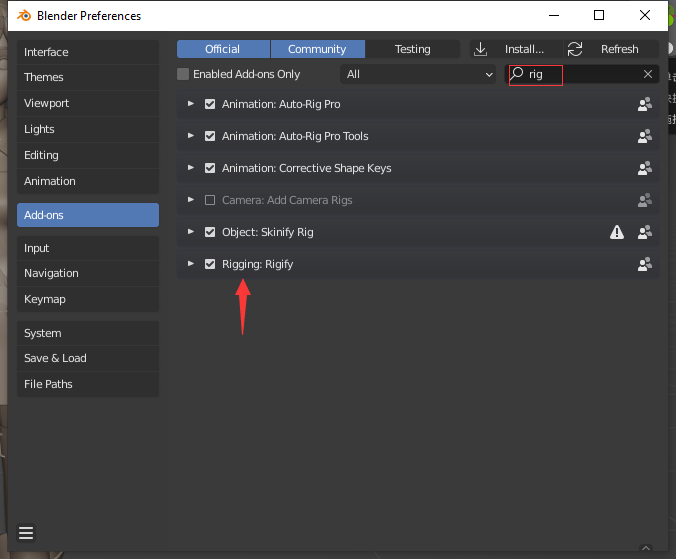 打开 Blender 首选项设置,在插件搜索栏,搜索 rig 找到 rigify