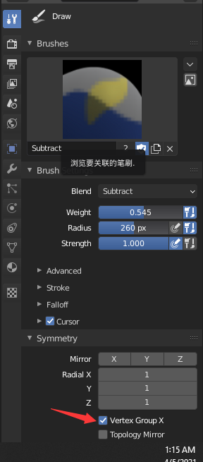 刷权重的时候姿势不是对称的时候,可以使用顶点组对称。
